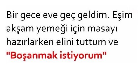 Sabah bana boşanma koşullarını anlattı. Benden tek bir şey istemiyordu. Boşanana dek hayatımızı eskisi gibi yaşamamızı istiyordu. Nedeni ise gayet basitti. Çocuğumuzun sınavları yaklaşıyordu ve çocuğumuzun durumdan etkilenmesini istemiyordu.