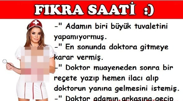 Adamın biri büyük tuvaletini yapamıyormuş.En sonucunda hekime gitmeye karar vermiş.Doktor muayeneden sonra bir reçete yazıp anında ilacı alıp hekimin yanına gelmesini istemiş.Adam söyleneni yapmış.Doktor adamın arka kısmına geçip…Fıkranın devamı için lütfen görsele dokunun…