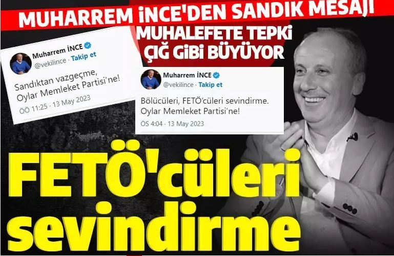 Memleket Partisi Genel Başkanı Muharrem İnce sosyal medyadan yaptığı paylaşımda, "Sandıktan vazgeçme, Oylar Memleket Partisi’ne!" dedi.