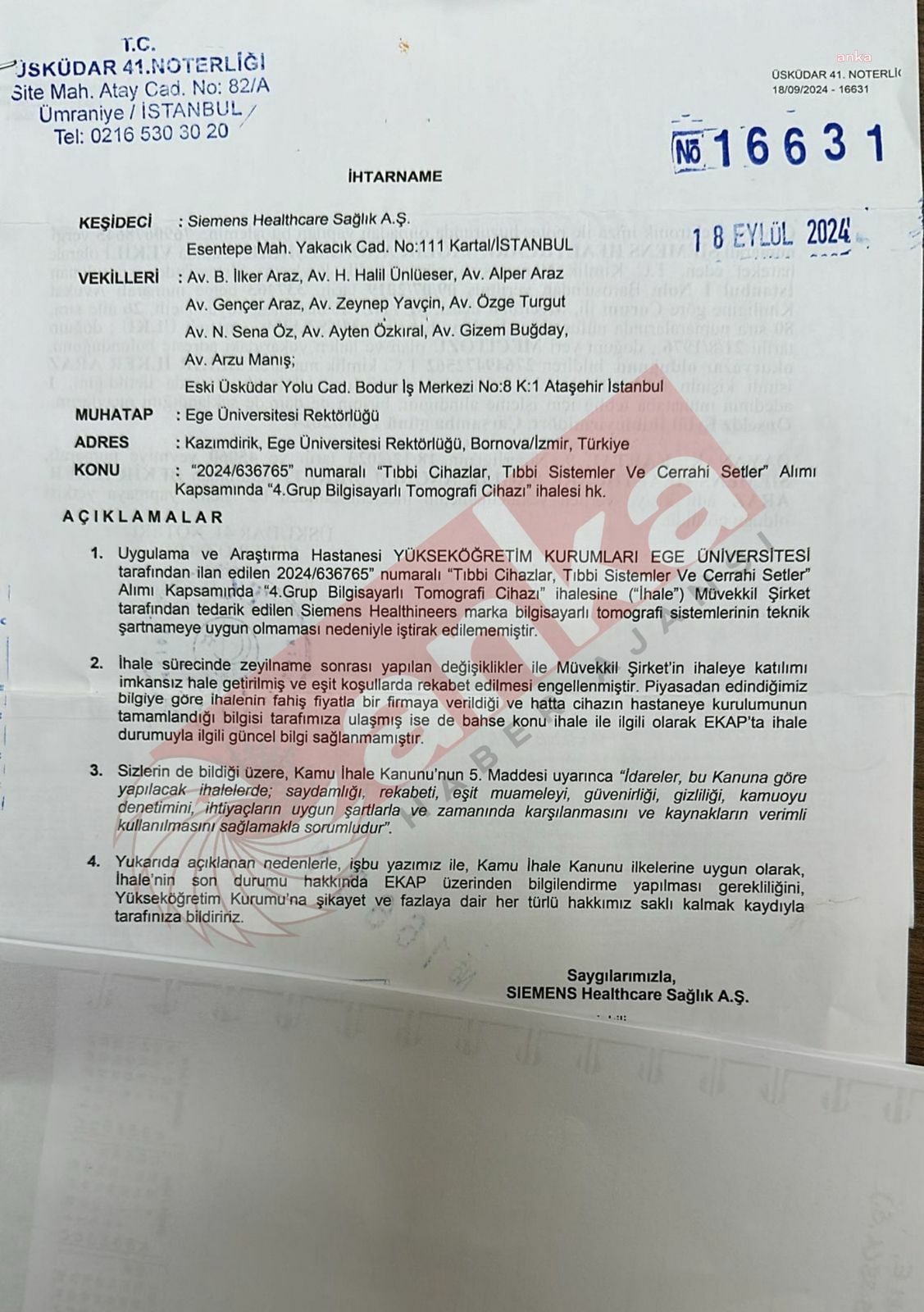 Siemens Healthineers ile Ege Üniversitesi arasında bir anlaşmazlık patlak verdi. Siemens Healthcare Sağlık A.Ş.'nin avukatları, noterden gönderdikleri ihtarnamede, üniversite hastanesine alınacak tıbbi cihazlar için gerçekleştirilen ihalenin "adrese teslim yapıldığını" öne sürdü.