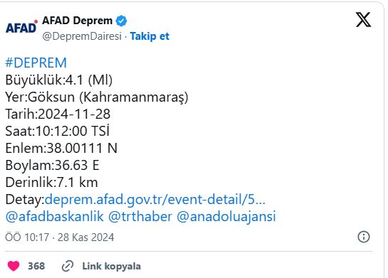 Kahramanmaraş'ın Göksun ilçesinde saat 10.12'de 4,1 büyüklüğünde bir deprem meydana geldi. AFAD'ın paylaştığı bilgilere göre depremin derinliği 7,1 kilometre olarak ölçüldü.