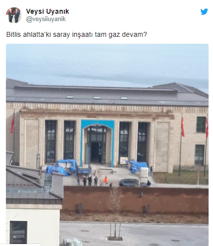 CHP Bitlis İl Başkanı Veysi Uyanık, sosyal medya hesabında yaptığı fotoğraflı paylaşımda, “Bitlis ahlatta’ki saray inşaatı tam gaz devam.” ifadelerini kullandı.