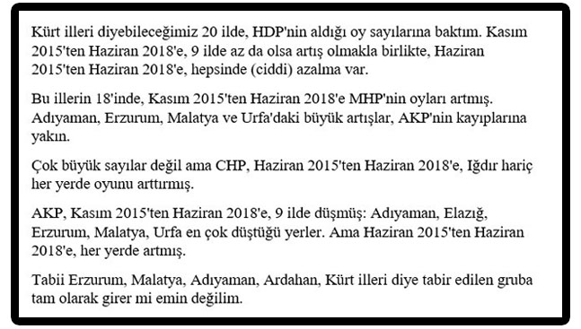 MHP’nin oylarına da değinen HDP’li Şık, “Bir de MHP'nin, 1Kasım'a oranla neredeyse koruduğu oy sayıları ve Kürt seçmenin yoğunlukta olduğu yerlerdeki astronomik oy artışı gerçekten dikkat çekici. Güneydoğu ve dogu illerinde ise ortaya çıkan tabloyu @timolenko şöyle anlatmış” dedi ve “Timolenko” isimli kullanıcının paylaşımını aktardı: