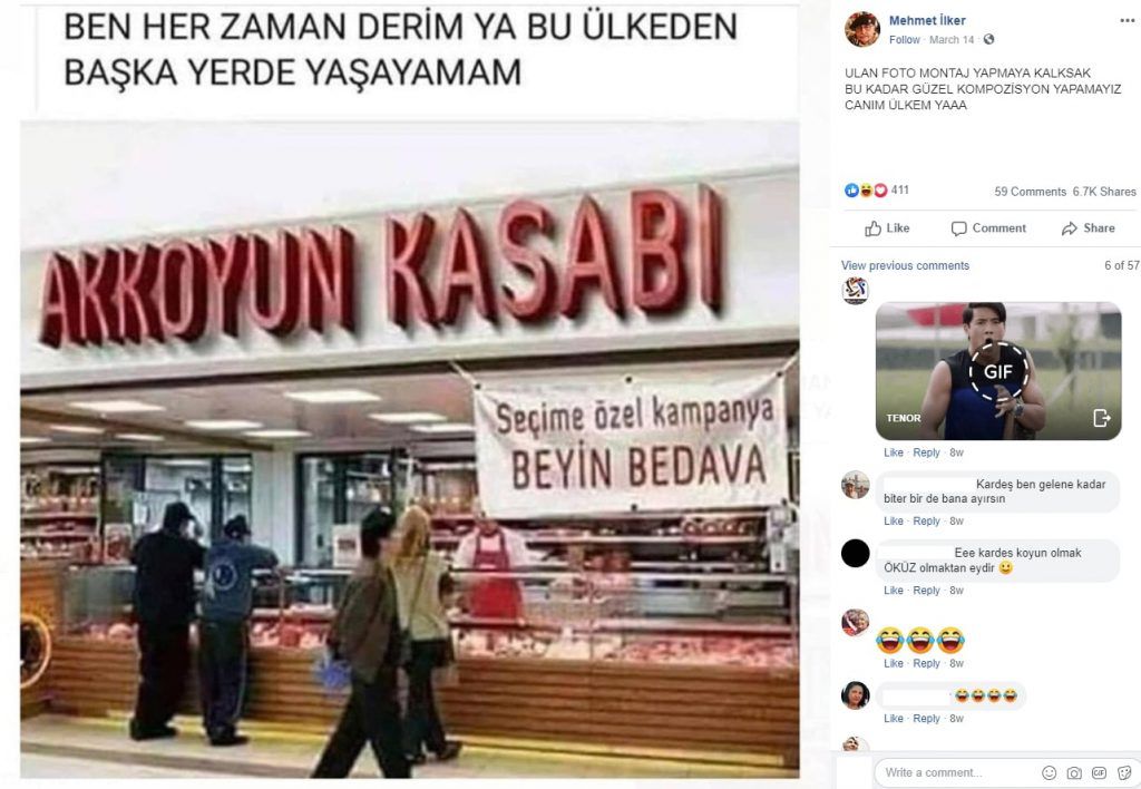 Sosyal medyada 2015’ten bu yana birçok defa paylaşıldığı görülen bu iddia, İstanbul’daki Belediye Başkanlığı seçiminin tekrarlanmasıyla yeniden gündeme geldi. Fotoğrafta Akkoyun Kasabı’nın “Seçime özel kampanya – Beyin Bedava” yazılı bir pankart asmış olduğu görülüyor. 14 Mart 2019’da bir Facebook kullanıcısı tarafından paylaşılan görsel, yaklaşık 7 bin paylaşım aldı. Ayrıca bu görsel, 23 Haziran İstanbul Büyükşehir Belediyesi Başkanlığı seçimleri yaklaştıkça birkaç sosyal medya kullanıcısı tarafından tekrar gündeme getirildi.