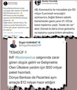 IMF tarafından 4 Mart'ta açıklanan koronavirüsün vurduğu ülkelere kredi desteği paketi nedeniyle Türkiye'nin bu destekten yararlanmak için vaka açıklaması yaptığını iddia edenler arasında Sözcü Gazetesi ekonomi yazarı Murat Muratoğlu, Tele1'de yayın yapan Merdan Yanardağ, CHP İstanbul Milletvekili Özgür Karabat gibi isimler yer aldı.