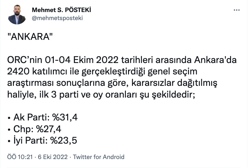 ORC Araştırma Genel Müdürü Mehmet Pösteki, Ankara özelinde yaptıkları araştırmanın sonuçlarını kişisel Twitter hesabı üzerinden paylaştı.