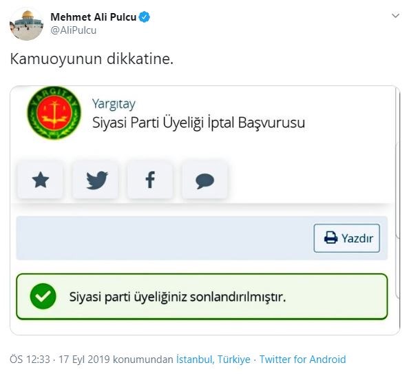Mehmet Ali Pulcu, kişisel Twitter hesabından yaptığı paylaşımla, AKP’den istifa ettiğini duyurdu.