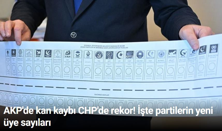Yargıtay Cumhuriyet Başsavcılığı, Türkiye'deki siyasi partilerin güncel üye sayılarını yayımladı. Kamuoyuyla paylaşılan verilere göre, AKP 250 binin üzerinde üye kaybetti ancak 10 milyon 878 bin 733 üyeyle en fazla üyeye sahip siyasi parti oldu.