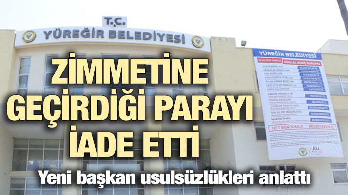 Adana'da 420 bin nüfuslu merkez Yüreğir ilçesinde yeni seçilen Belediye Başkanı Ali Demirçalı, belediyenin geçmiş borcunun 883 milyon 857 bin 423 lira olduğunu, bir personelin zimmetine geçirdiği 1 milyon 200 bin lirayı belediyenin hesabına geri yatırdığını, bu kişi hakkında adli soruşturma başlatılması için suç duyurusunda bulunacaklarını söyledi.