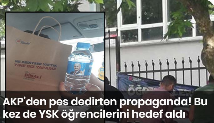 Birgün’de yer alan habere göre, 2 milyon 528 bin 110 adayın girdiği YKS öncesi İstanbul Kağıthane’de AKP propagandası yapıldı. İstanbul Kağıthane’de bulunan Tınaztepe İlköğretim Okulu’nda henüz sınava girişler devam ediyorken YKS’ye girecek olan öğrencilere içinde AKP’nin adayı Binali Yıldırım’a ait olan ‘set’ dağıtıldı. Setin içinde üzerinde Binali Yıldırım’ın fotoğrafı bulunan su ve sandviç yer alıyor.