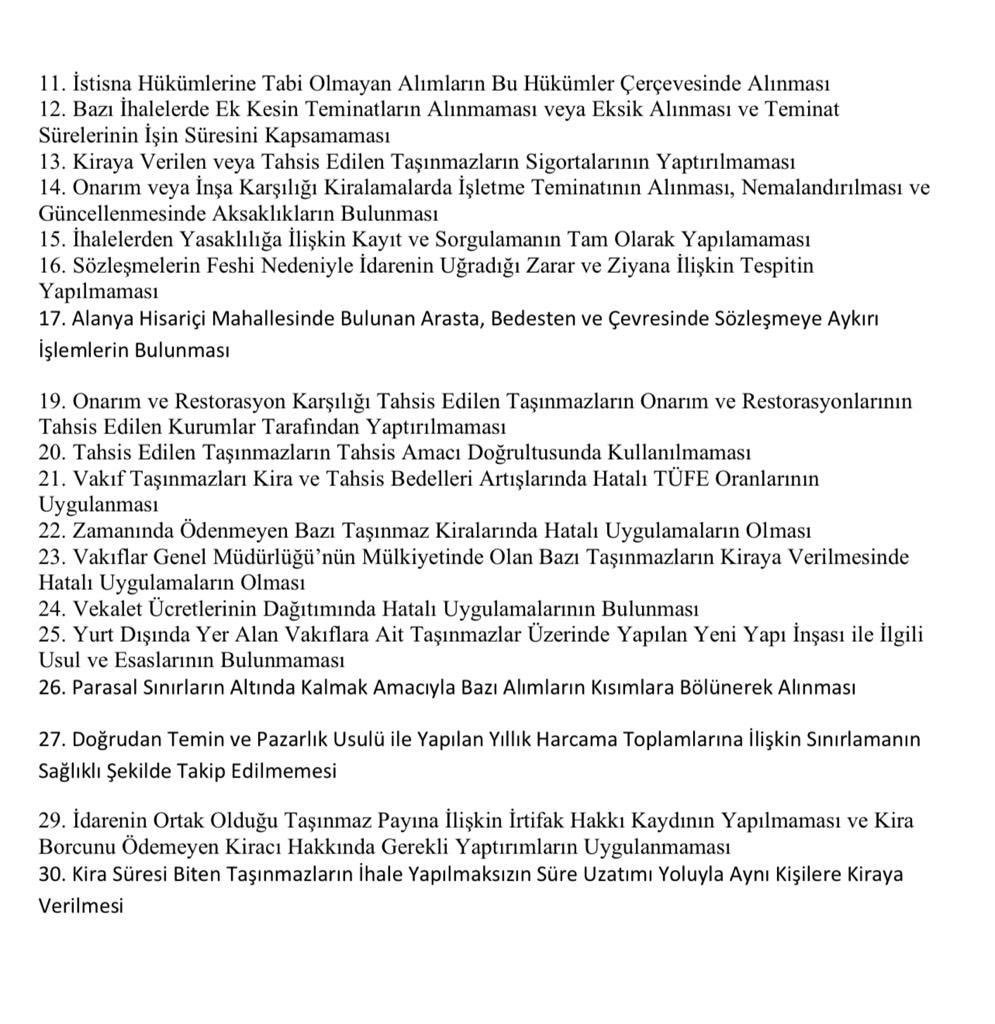 Tekrar dönelim Sayıştay’ın tespitlerine... Bazı ihalelerde ek kesin teminat alınmayarak belirli firmalara avantaj sağlanmış. Kiraya verilen yerlerin sigortalarının yaptırılmamasına bile göz yumularak bazı kiracılara rant yaratılmış. Kim bu firmalar, kiracılar? Bitmedi... Vakıflar’a ve mazbut vakıflara ait taşınmazların onarım veya inşa karşılığı kiralamalarında, bazılarının teminat işlemlerinde kurumun aleyhine işlemler yapılıyor. Bunu yapan firmalara da göz yumuluyor. Sözleşmesi feshedilenlerden, bu fesih nedeniyle idarenin uğradığı zararın yükleniciye tazmin ettirilmemesi nedeniyle Vakıflar zarar ettiriliyor. Yine firmalara avantaj sağlanıyor. Adrese teslim, davetiye usulü ihaleler yapılıyor...