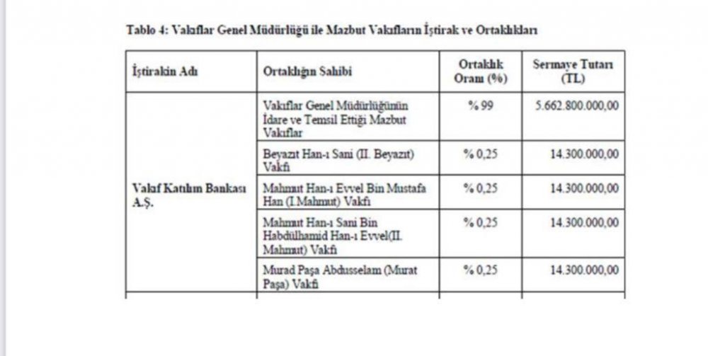 Vakıf Katılım Bankası’nın %99 hissesi Vakıfların. Sözde 'faizsiz' finans... Ancak Vakıfların başlı başına faiz gelirleri var. Vakıfların mali tablolarında faiz geliri gizlenmeye çalışılıyor. Ancak 2021’de 156,2 milyon TL faiz geliri elde ettiğini görüyoruz. Peki, lafa gelince AKP Vakıflar için neler söylüyor. Cumhurbaşkanı Yardımcısı Fuat Oktay’ın, vakıf kültürü için geçen mayıs ayında neler dediğini hatırlayalım... Oktay, vakıf hizmetlerinin esasını "Allah rızasını kazanma" gayesinin oluşturduğunu söyledi. Fuat Oktay, "Bilindiği gibi vakıf senetlerinde, vakıf mallarının gayesi haricinde kullanılmasına karşı çok ağır beddualar vardır. Akıl, vicdan ve inanç sahibi hiç kimsenin, bu bedduaları görüp de vakıf malına el uzatması, istismara ve gasba yeltenmesi mümkün değildir" dedi.