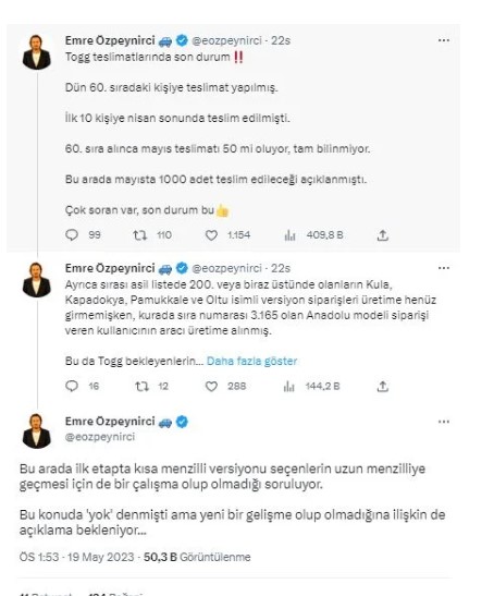 Gazeteci Özpeynirci, Togg teslimatlarına ilişkin son durumu 19 Mayıs'ta yaptığı paylaşımla duyurdu.