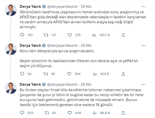 Görüntülerin tarafımıza ulaşmasının hemen ardından konu araştırılmış ve AFAD’dan gıda desteği alan depremzede vatandaşların talebini karşılamak ve yardım amacıyla AFAD’dan alınan kolilerin araçla taşındığı bilgisi alınmıştır. Bu türden olayları fırsat bilip kendilerine istismar malzemesi çıkartmaya çalışanlar da şunu iyi bilsin ki bugüne kadar bu necip milletin tek bir helal kuruşuna halel getirmedim, getirilmesine de müsaade etmem. Bunun tasdiki için beklemeniz gereken süre sadece 18 gündür."