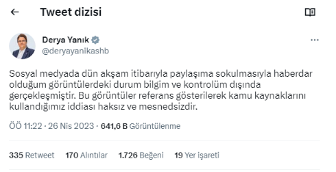 "Sosyal medyada dün akşam itibarıyla paylaşıma sokulmasıyla haberdar olduğum görüntülerdeki durum bilgim ve kontrolüm dışında gerçekleşmiştir. Bu görüntüler referans gösterilerek kamu kaynaklarını kullandığımız iddiası haksız ve mesnedsizdir.