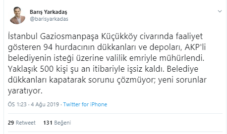 CHP 26. dönem Milletvekişi Barış Yarkadaş, İstanbul Gaziosmanpaşa'da 94 hurdacının dükkanları ve depoları, AKP'li belediyenin isteği üzerine mühürlendiğini belirtti.