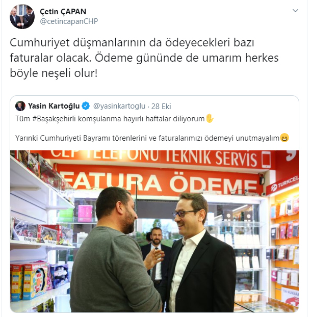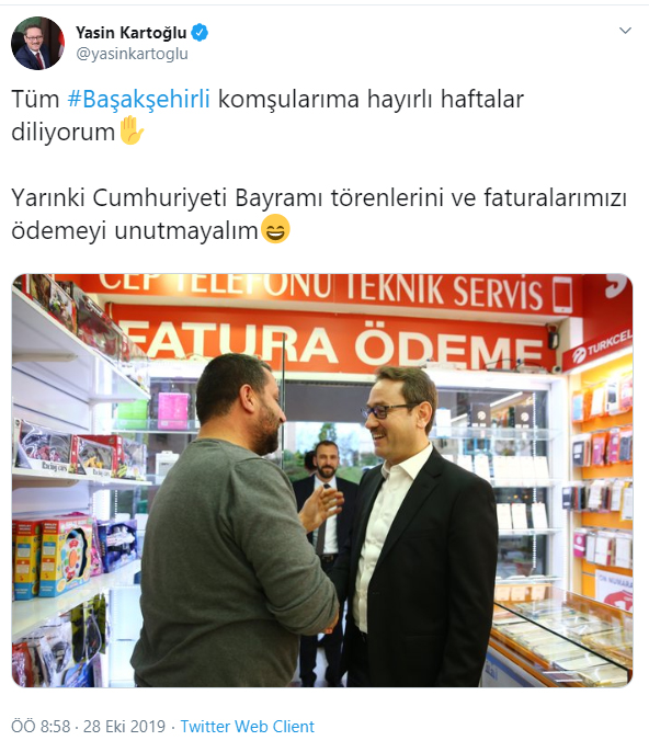 Kartoğlu resmi Twitter hesabından esnaf ziyeretinden bir fotoğraf paylaşarak, "Tüm #Başakşehirli komşularıma hayırlı haftalar diliyorum. Yarınki Cumhuriyeti Bayramı törenlerini ve faturalarımızı ödemeyi unutmayalım" diye yazdı.
