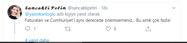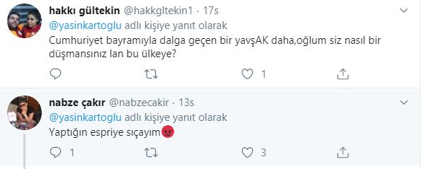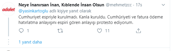 Kartoğlu'nun bu paylaşımı sosyal medyada büyük tepki çekti. Kartoğlu'nun tweetinin altına birçok yorum yapıldı. CHP'li siyasetçi Çetin Çapan da Kartoğlu'nun paylaşımına, "Cumhuriyet düşmanlarının da ödeyecekleri bazı faturalar olacak. Ödeme gününde de umarım herkes böyle neşeli olur!" diyerek tepki gösterdi.