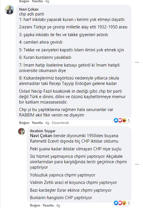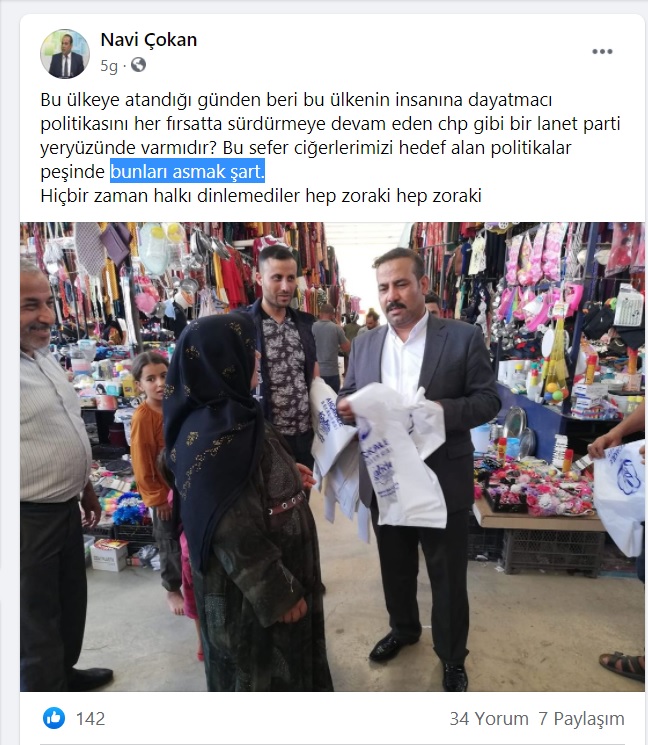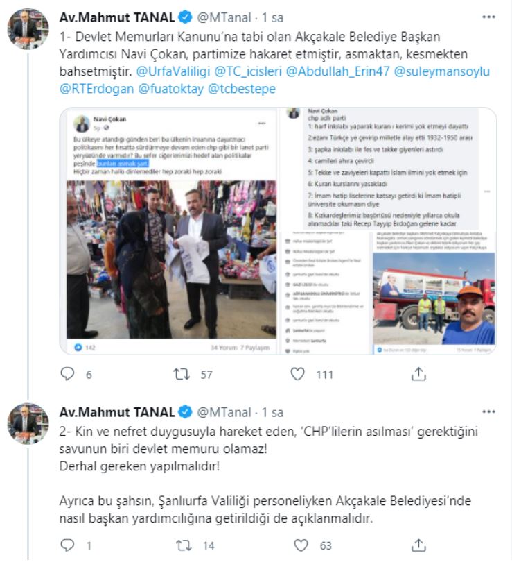 2 Kin ve nefret duygusuyla hareket eden, ‘CHP’lilerin asılması’ gerektiğini savunun biri devlet memuru olamaz! Derhal gereken yapılmalıdır! Ayrıca bu şahsın, Şanlıurfa Valiliği personeliyken Akçakale Belediyesi’nde nasıl başkan yardımcılığına getirildiği de açıklanmalıdır.
