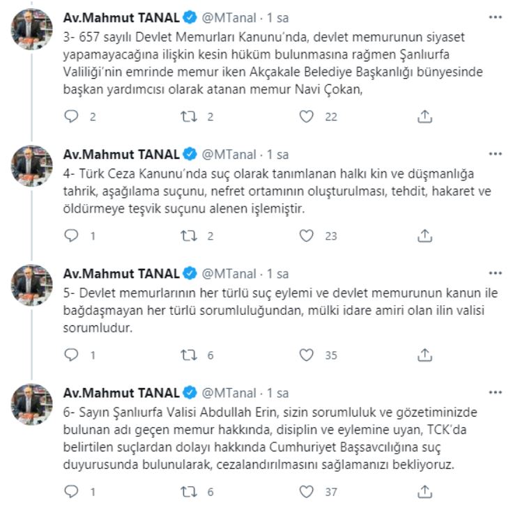 Çokan'ın gönderilerini paylaşan Tanal, Şanlıurfa Valisi'ne çağrı yaptı.