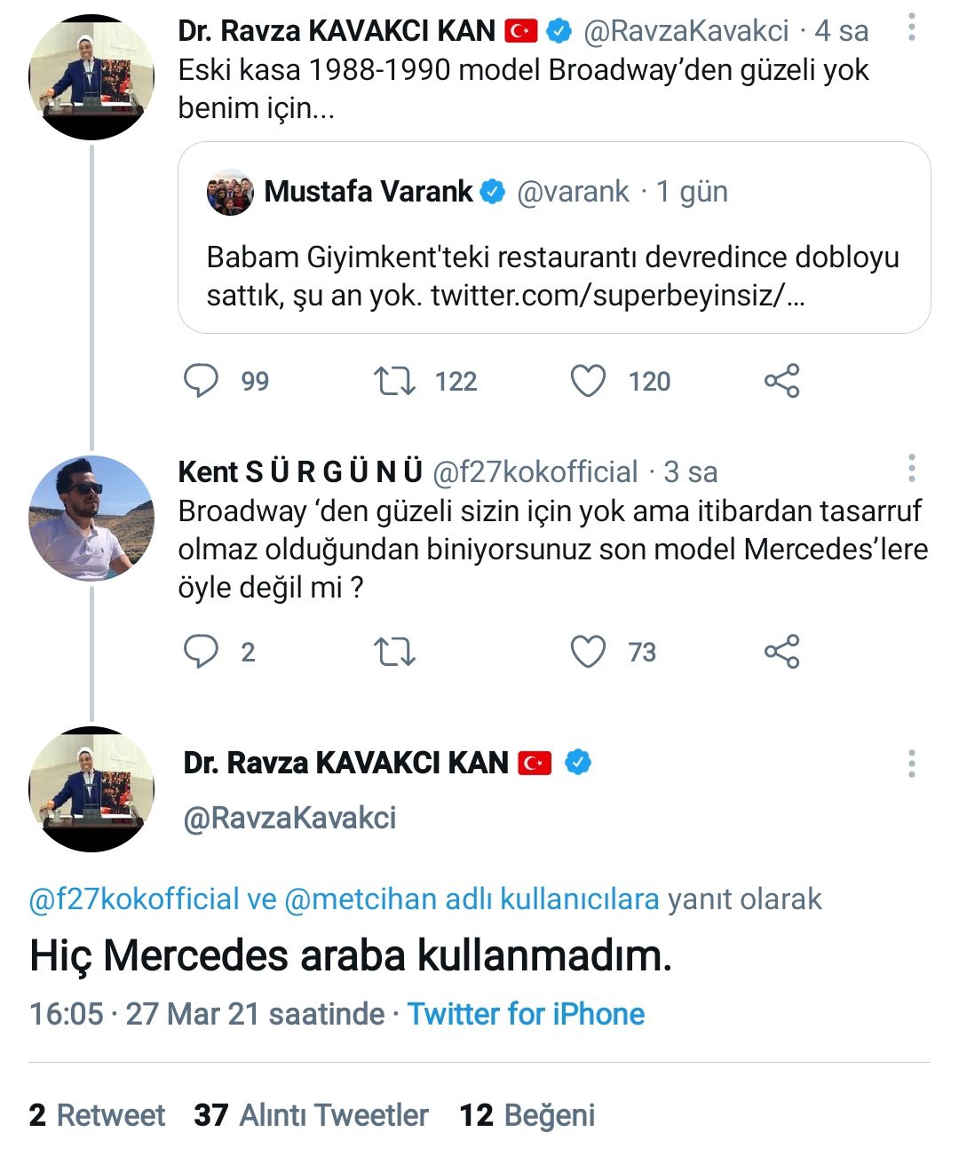 Bu tweeti alıntılayarak "Eski kasa 19881990 model Broadway’den güzeli yok benim için..." yazan Kavakcı Kan'a takipçilerinden biri "Öyle olduğu için mi Mercedes'e biniyorsunuz?" diye sordu. Bunun üzerine Ravza Kavakcı Kan, hiç Mercedes araba kullanmadığını söyledi.