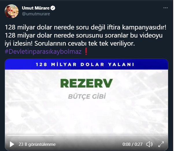 27 saniyelik bir video hazırlayan trol, "128 milyar dolar nerede soru değil iftira kampanyasıdır! 128 milyar dolar nerede sorusunu soranlar bu videoyu iyi izlesin! Sorularının cevabı tek tek veriliyor. #Devletinparasıkaybolmaz " yazarak söz konusu videoyu paylaştı.