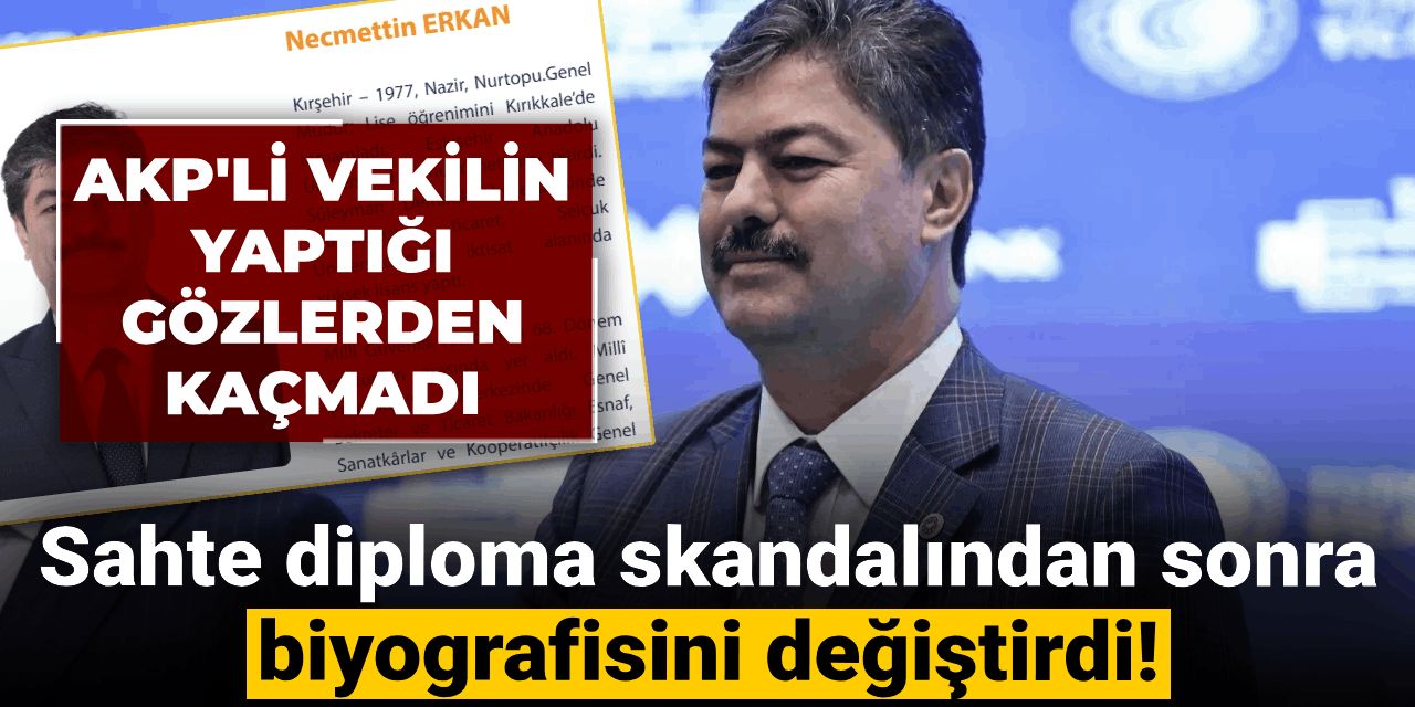 AKP Kırşehir milletvekili Necmettin Erkan'ın, eski biyografisinde, lisans eğitimini Anadolu Üniversitesi Kamu Yönetimi ile Uluslararası Balkan Üniversitesi Hukuk alanında tamamladığı görülüyor. Erkan’ın, güncellenen biyografisinden "Balkan Üniversitesi" ifadesi çıkarıldı.