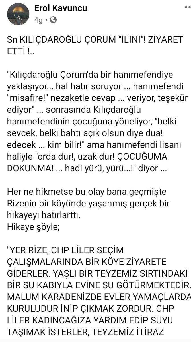 Kavuncu, Kılıçdaroğlu’na Çorum’da yapılanı kendisine Rize’nin bir köyünde yaşanmış bir hikayeyi hatırlattığını belirterek; “Yer Rize, CHP’liler seçim çalışmalarında bir köye ziyarete giderler. Yaşlı bir teyzemiz sırtındaki bir su kabıyla evine su götürmektedir. Malum Karadeniz’de evler yamaçlarda kuruludur. İnip çıkmak zordu. CHP’liler kadıncağıza yardım edip suyu taşımak isterler. Teyzemiz itiraz etsede, suyunu taşırlar. Teyzenin evine tam varacakken, CHP’liler biz CHP’liyiz seçim çalışması için geldik der demez teyze, “ Evladım, baştan söyleseydiniz ya, ben o suyla abdest alacaktım tövbe, tövbe der ve suyu olduğu gibi döker” ifadelerini kullandı.