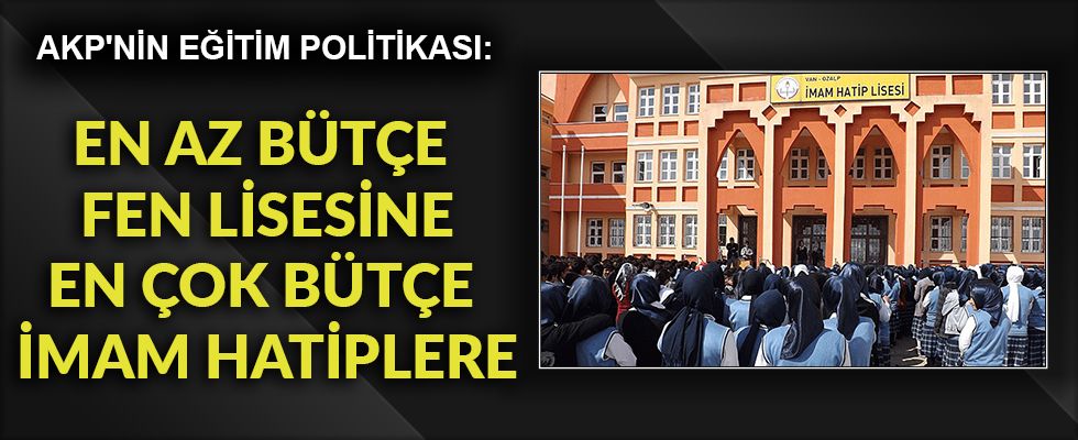 Cumhuriyet’ten Ozan Çepni’nin haberine göre önümüzdeki 4 yıla ilişkin projelendirmenin yer aldığı programa göre bütçeden aslan payını imam hatip liseleri ve ucuz iş gücü yetiştirmesi planlanan meslek liseleri aldı. Veli ve öğrencilerin tercihleri ile başarıları göz önüne alındığında ilk sırada yer alan fen liseleri bütçeden en az payı alırken MEB imam hatiplere 10 kat fazla bütçe ayırdı.