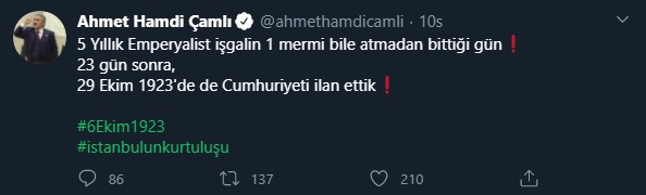 "5 Yıllık Emperyalist işgalin 1 mermi bile atmadan bittiği gün! 23 gün sonra, 29 Ekim 1923'de de Cumhuriyeti ilan ettik!"