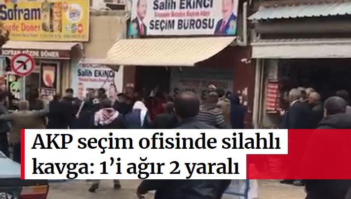 Viranşehir’de meydana gelen olay iddiaya göre, Salih Ekinci’nin seçim ofisinde AKP’nin belediye meclis üyesi adayı İsmail Eroğlu ile yine AKP’li olan kişiler arasında alacak verecek meselesi yüzünden meydana geldi. İsmail Eroğlu’nun açtığı ateş sonucu 1’i ağır 2 kişi yaralandı. Yaralılar Şanlıurfa Devlet Hastanesi’ne kaldırılarak tedavi altına alındı.