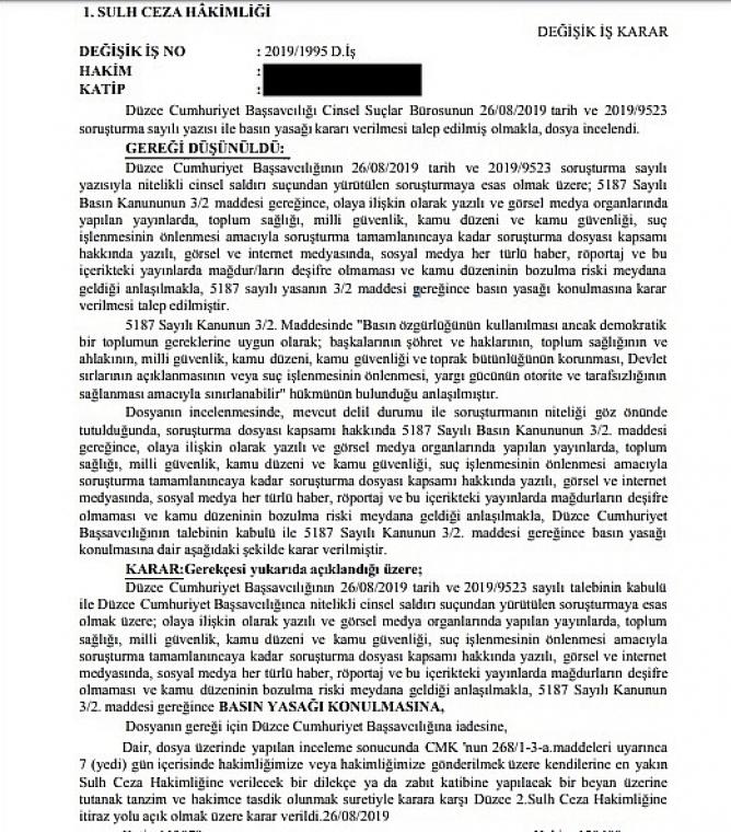 Cumhuriyet Başsavcılığı'na verdiği ifade de skandal iddialarda bulundu. Düzce 1. Sulh Ceza Hakimliği’nin 2019/1995 sayılı kararı gereği habere 'Basın Yasağı' konuldu.