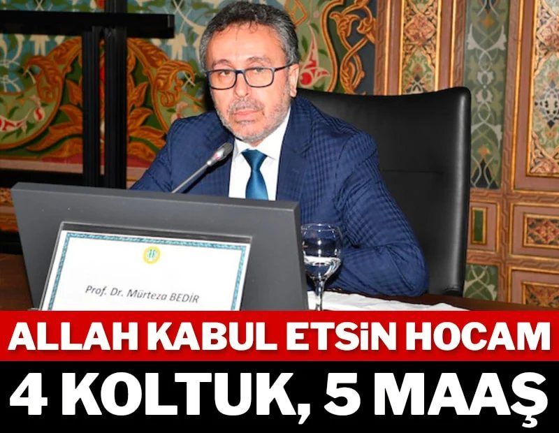 AKP iktidarında birden fazla koltuğa oturarak maaş alanlardan birisinin de Diyanet Diyanet Araştırma Merkezi Başkanı Prof. Murteza Bedir olduğu ortaya çıktı. Bedir, 4 koltuklu, 5 maaşlı çıktı. Fetva ve İslam hukuku alanlarında uzman olan Bedir emekli profesör maaşı alıyor. Diyanet Vakfı 29 Mayıs Üniversitesi’nde öğretim üyesi, Diyanet Vakfı İslam Araştırmaları Merkezi Başkanı, Vakıf Katılım Danışma Komitesi Başkanı ve YÖK Genel Kurul üyesi olarak 4 koltuğu var. Emeklilik ile birlikte 5 maaş alıyor.