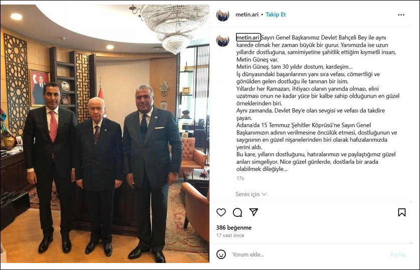MHP MYK üyesi Metin Ari, MHP Genel Başkanı Devlet Bahçeli'nin fotoğrafını paylaştı. Yanlarında da iş adamı Metin Güneş vardı