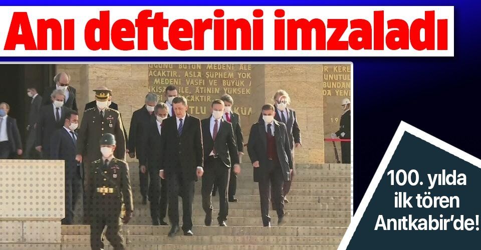 Heyettekiler maske takarken, Aslanlı Yol'daki yürüyüş, mozoleye çelenk bırakılması ve Anıtkabir Özel Defteri'nin imzalanması sırasında sosyal mesafe korundu.