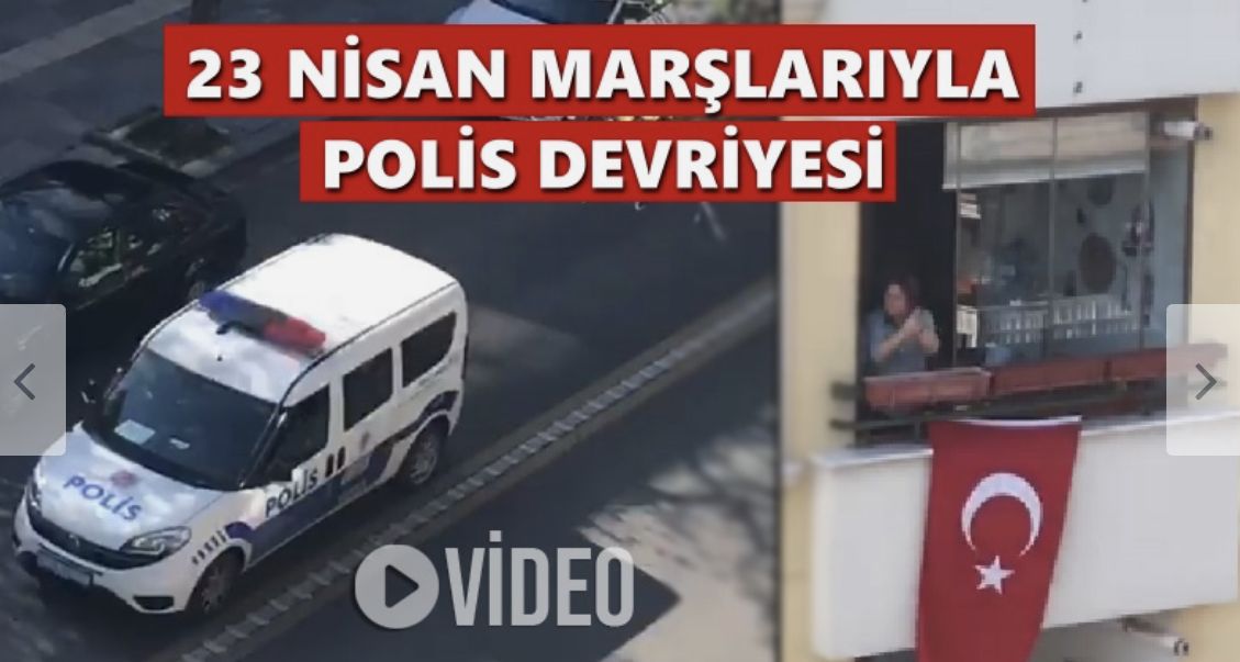 Çankaya Emniyet Müdürlüğü polis devriyesi 23 Nisan marşlarıyla Ankara sokaklarında kutlama yapıyor. Polis araçlarından gelen marşlara balkonlardan alkış sesleriyle destek geliyor.