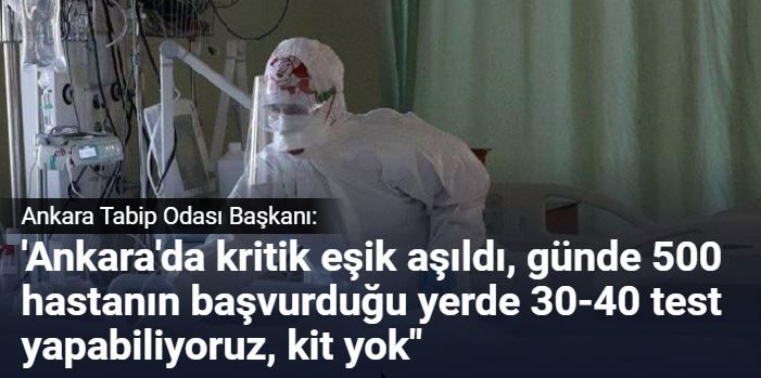 Ankara’da Sağlık ve Sosyal Hizmet Emekçileri Sendikası’nın (SES) verilerine göre, 1 Haziran’dan bu yana 500’e yakın sağlık çalışanı hizmetten çekildi. Ankara Tabip Odası (ATO) Yönetim Kurulu Başkanı Ali Karakoç, kentte kritik eşiğin aşıldığını belirterek, "Çalıştığımız kurumlarda günde 500 hastanın başvurduğu orta ölçekli bir yerde 3040 test yapabiliyoruz, kit yok" ifadesini kullandı. Mezopotamya Ajansı’ndan Emrullah Acar’a konuşan Karakoç, "Bunun nedenini biz de kendimize soruyoruz ama sanırım bu soruya en iyi cevap verecek kişi Sağlık Bakanı olsa gerek. Eminim ellerinde bununla ilgili veri de var ama bunları halk ile paylaşmıyorlar. Bu nedenleri yurttaşlar bilse ona göre önlem alırlar" diye konuştu.