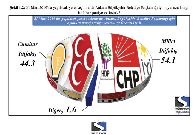 “SAROS Araştırma servisinin 31 Mart'ta yapılacak yerel seçimler için yaptığı Ankara Büyükşehir Belediye Başkanlığı konusundaki araştırmada; ‘31 Mart 2019'da yapılacak yerel seçimlerde Ankara Büyükşehir Belediye Başkanlığı için oyunuzu hangi İttifaka / partiye verirsiniz’ sorusuna katılımcıların verdiği cevaplar şöyle;