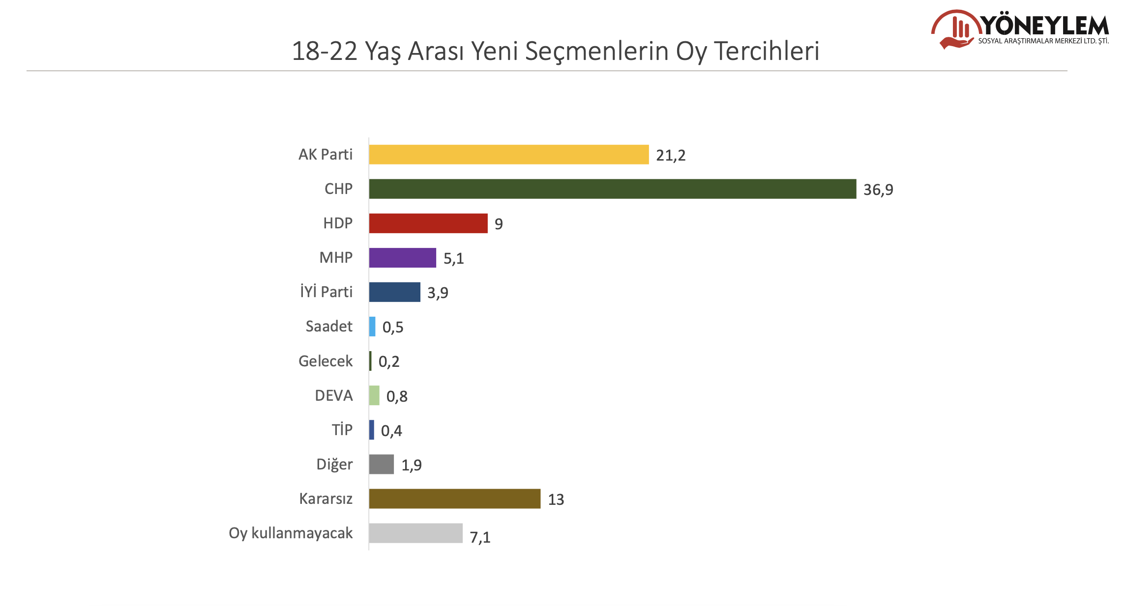 Yeni seçmene oy tercihleri soruldu; CHP, yüzde 36,9 ile birinci parti oldu. İkinci sırada, yüzde 21,2 ile AKP yer aldı.