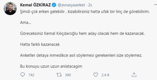 Sosyal medya hesabından yaptığı paylaşımda Kemal Özkiraz, “Göreceksiniz Kemal Kılıçdaroğlu hem aday olacak hem de kazanacak” diye yazdı.