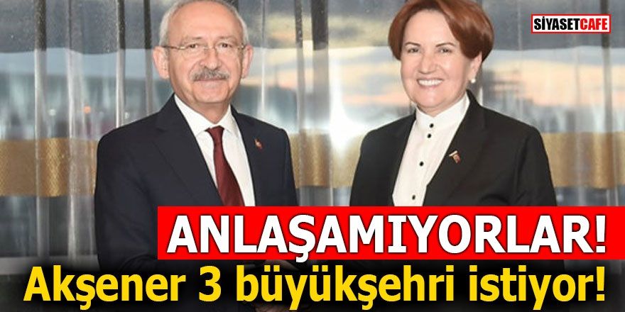CHP lideri Kemal Kılıçdaroğlu’nun İYİ Parti lideri Meral Akşener’i ziyaret etmesinin ardından iki parti arasında başlayan görüşmeler yaklaşık 2 haftadır devam ediyor. Alınan bilgiye göre, görüşmelerin iki haftadır devam etmesine karşın herhangi bir sonuç alınamamasının başında üç büyükşehir belediyesi üzerinde yaşanan anlaşmazlığın geldiği öğrenildi.