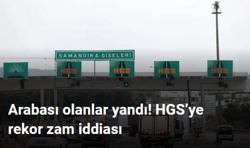 9 Temmuz 2024 tarihi itibarıyla Hızlı Geçiş Sistemi'nde (HGS) alt limit fiyatlarına yüzde 40 zam yapılacağı açıklandı. 1 Nisan'da alt limit fiyatları yüzde 75 oranında artırılmıştı.