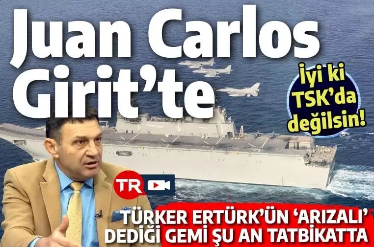 2010 yılında Türk Silahlı Kuvvetleri'nden istifa ederek emekli olan Türker Ertürk, TELE1 yayınında TCG ANADOLU'yu kötülerken, onun İspanyol ikizi Juan CarlosI gemisi Doğu Akdeniz'deki tatbikata katılmak üzere Girit'teydi.