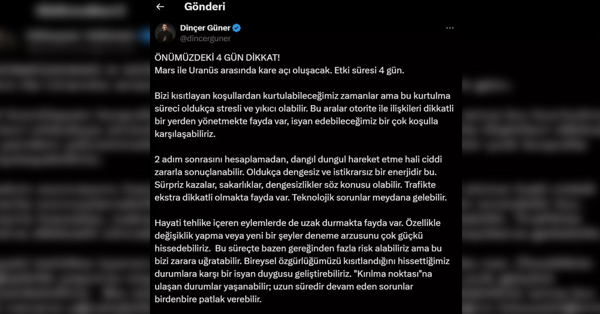 Ünlü Astrolog Dinçer Güner, sosyal medya hesabından yaptığı paylaşımlarla korkuttu. Güner, ''önümüzdeki 4 güne dikkat'' sözleriyle endişelendirerek son tahminlerini paylaştı.