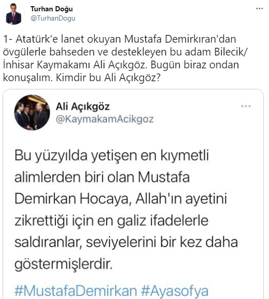 Ayasofya Cami'de kılınan namazın hutbesinde Cumhurbaşkanı Erdoğan'ın da dinlediği sırada Türkiye Cumhuriyeti'nin kurucusu Gazi Mustafa Kemal Atatürk'e hakarette bulunarak "Bu ve bu gibi mabedlerin mabed olarak kalması için inşa edilmiştir. Öyle bir zaman geldiki bir asır gibi bir zaman içinde ezan ve namaz yasaklandı ve müze haline çevrildi. Bunlardan daha zalim ve kafir kim olabilir... Yarabbi bir daha bu zihniyetin bu ümmetin başına gelmesini mukadder buyurma..." ifadelerini kullanan İmam Mustafa Demirkan'a Bilecik İnhisar Kaymakamı Ali Açıkgöz sahip çıkmıştı.