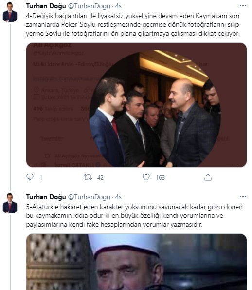 5Atatürk'e hakaret eden karakter yoksununu savunacak kadar gözü dönen bu kaymakamın iddia odur ki en büyük özelliği kendi yorumlarına ve paylasımlarına kendi fake hesaplarından yorumlar yazmasıdır.