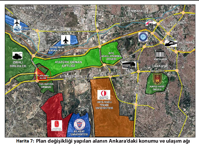 TMMOB: Nasıl ve hangi şartla kiralanıyor belli değil, tam bir talan yaşıyoruz Vakfın, AOÇ arazisiyle ilişkisi Türk Mühendis ve Mimar Odaları Birliği (TMMOB) Ankara Şubesi’nin AOÇ arazisinin 555 bin metrekarelik bölümünde plan değişikliğine gidilmesi konusunda açtığı davayla ortaya çıktı. TMMOB Ankara Şube Başkanı Tezcan Karakuş Candan, arazinin vakfa tahsis edildiğini TEBA Vakfı’nın açtıkları davaya müdahil olmasıyla anladıklarını söyledi. Hem AOÇ arazisi, hem Gar binalarının tahsisi konusunda devam eden davalarda henüz verilmiş bir yürütmeyi durdurma kararı yok. AOÇ’de Zırhlı Birlikler Komutanlığı’na tahsis edilen ve ağaçlandırılan bölge, plan değişikliğinden önce “yeşil alan” olarak görünüyordu. Bir dönem stadyum yapımı için tahsis edilmesi düşünülen alan, iddiaya göre Hazine ve Maliye Bakanlığı’na tahsis edildi ve bakanlık eliyle kiralandı. Plan değişikliğine karşı dava açan TMMOB Ankara Şube, yürütmeyi durdurma istedi. Davaya TEBA Vakfı’nın müdahil olmasıyla, kiralamanın yapıldığı anlaşıldı.