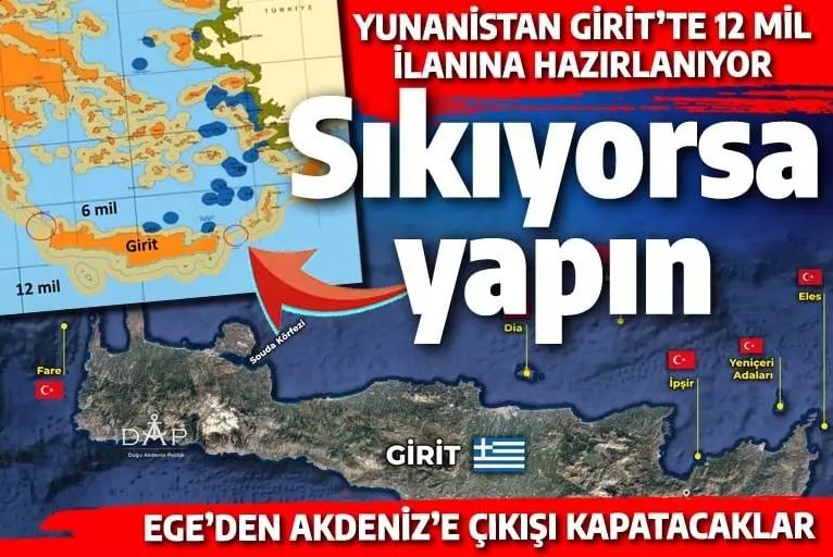 1995 yılında Ege'de 12 mil kararını açıklamaya hazırlanırken Türkiye'nin sert uyarısıyla geri adım atan Yunanistan, Türk donanmasının Ege'den Akdeniz'e çıkışını önlemeyi amaçlayan adımı ilk olarak Girit'te uygulayacak. Mart ayında devreye sokulması beklenen kararın Avrupa Birliği ve ABD'ye iletildiği ileri sürülüyor.