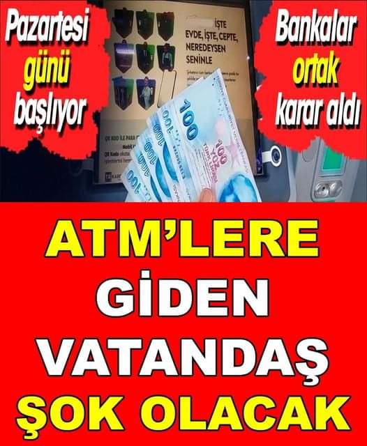 Bankaların aldığı karar doğrultusunda Pazartesi günü Türkiye’deki ATM’lerde önemli bir değişiklik yaşanacak. ATM’lere kartını sokanların karşısına çıkacak yazı sok yaşanmasına neden olacak. Türkiye’deki ATM kullanıcılarını şaşırtacak bir değişiklik yaklaşıyor.H-AB-E-Rİ-N D-E-VAM-I İ-Ç-İN GÖ-RS-ELE D-O-KUN-UNUZ….