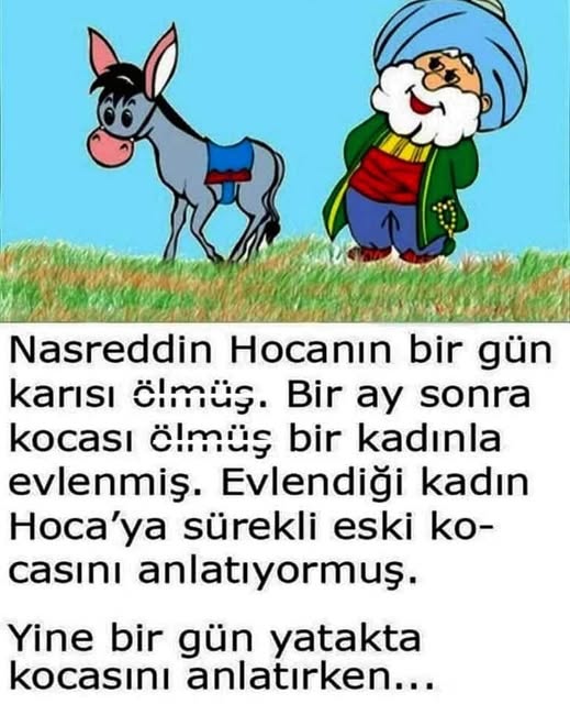 Nasreddin Hocanın bir gün karısı ö-lm-üş.Bir ay sonra kocası öl-mü-ş dul bir kadınla evlenmiş.Evlendiği kadın Hoca ya sürekli eski kocasını anlatıyormuş.Yine bir gün yatakta kocasını anlatıyordu.”İşte benim kocam şöyle yapardı, böyle yapardı” diye.Hoca sinirlenmiş ve kadına bir tekme atmış kadın yere düşmüş.Kadın sormuş: -Aman hoca niye attın beni yataktan? Hocanında cevabı hazır: -Eeee yatakta bi sen yatıyosun bi ben bide eski kocan.Ü.çümüz sığamadık sende düştün.